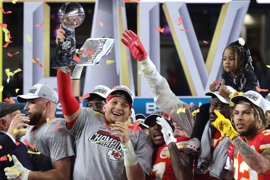 MIAMI, FLORIDA – FEBRUARY 02: Patrick Mahomes #15 of the Kansas City Chiefs raises the Vince Lombardi Trophy after defeating the San Francisco 49ers 31-20 in Super Bowl LIV at Hard Rock Stadium on February 02, 2020 in Miami, Florida. (Photo by Jamie Squire/Getty Images)